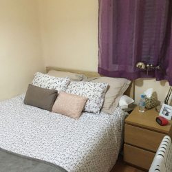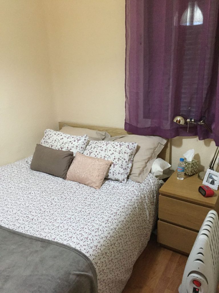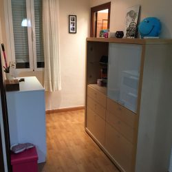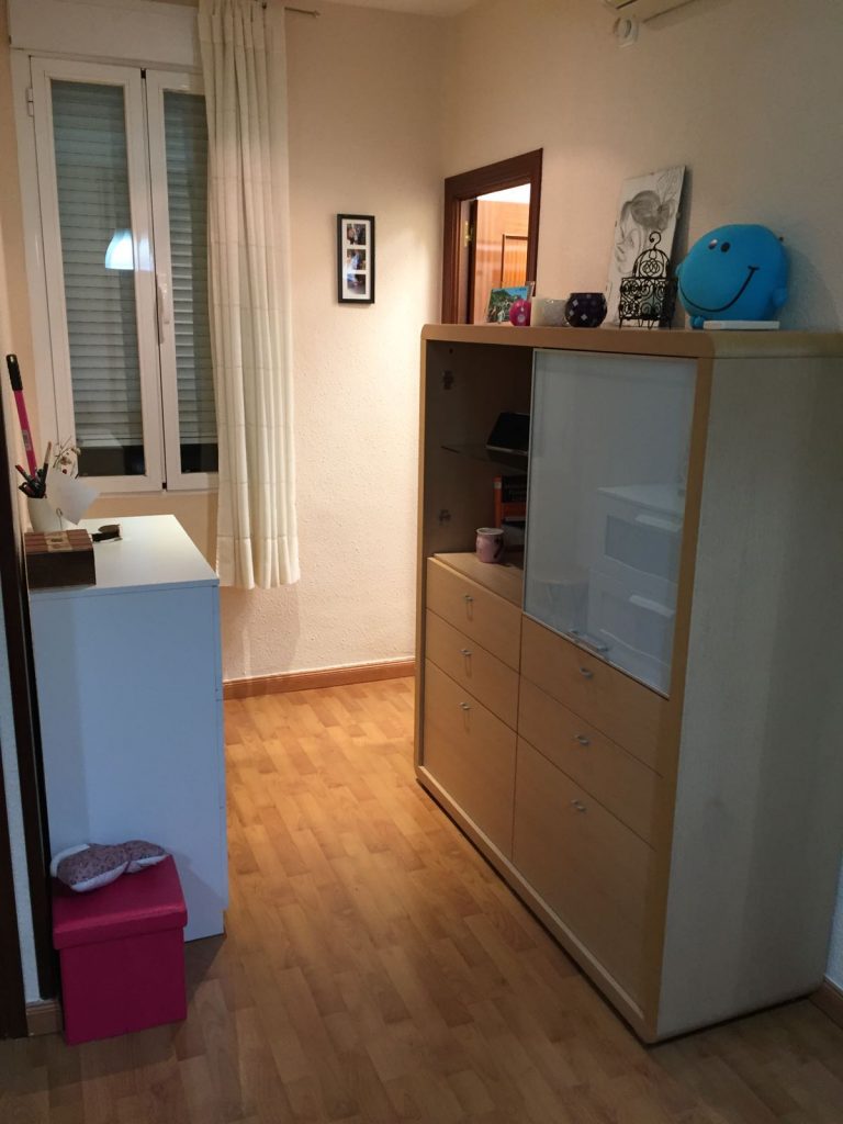 •1 Dormitorio independiente con vistas a un primer patio interior sin ruidos y muy luminoso. Tiene una cama de 1,35m, un gran armario empotrado de aprox 2,5×2,5m y TV DE 20”
