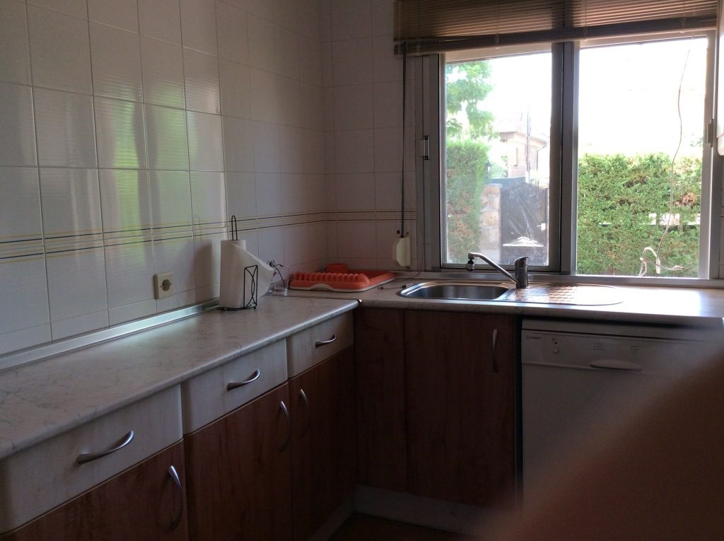 -1ª planta: Salón-comedor con climatizador y salida a porche trasero, con gran ventanal y muy luminoso. Cocina grande, amueblada con todos los electrodomésticos, hall y terraza grande delantera.